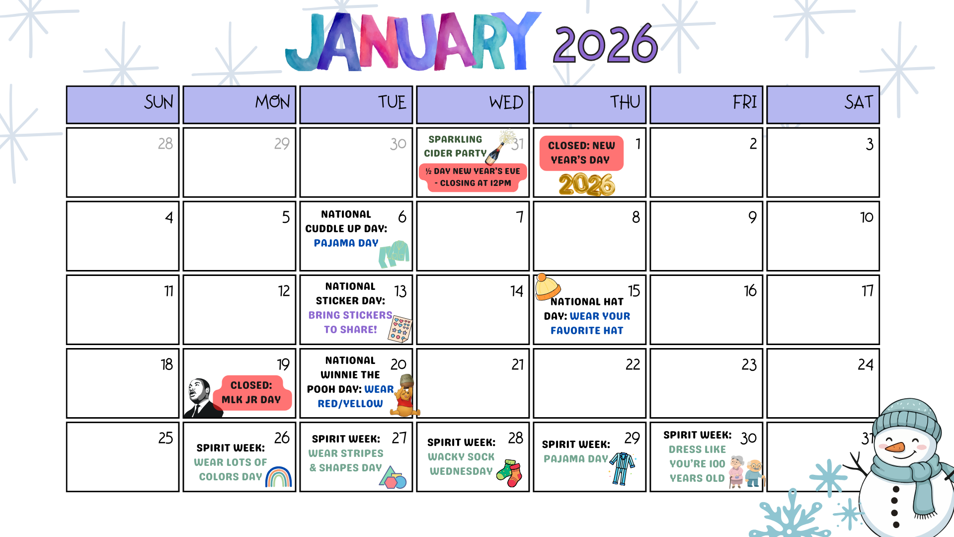 Stay informed about our closed days and spirit days by regularly checking our monthly calendars.